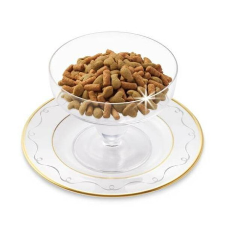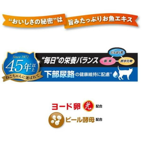 * 原材料: 穀類(とうもろこし、コーングルテンミール、小麦粉、等)、肉類(ミートミール、チキンミール、等)、豆類(おから、脱脂大豆、等)、魚介類(フィッシュミール、フィッシュエキス、まぐろエキス、かつおエキス、舌平目エキス、等)、油脂類(動物性油脂、ガンマーリノレン酸)、卵類(ヨード卵粉末)、ビール酵母、ビタミン類(A、D3、E、K3、B1、B2、パントテン酸、ナイアシン、B6、葉酸、ビオチン、B12、コリン、イノシトール)、ミネラル類(カルシウム、リン、ナトリウム、カリウム、塩素、鉄、コバルト、銅、マンガン、亜鉛、ヨウ素)、アミノ酸類(メチオニン、タウリン)、着色料(赤102)、酸化防止剤(ローズマリー抽出物、ミックストコフェロール)