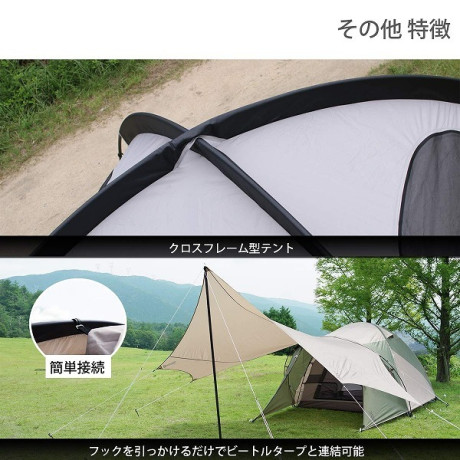 ドームテントの構造として最もよく使われるクロスフレーム型を採用。設営はスリーブにポールを通して固定するだけのシンプルな構造。また万が一ポールが破損した際もフレーム交換が容易です。