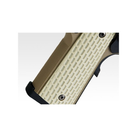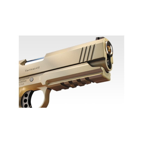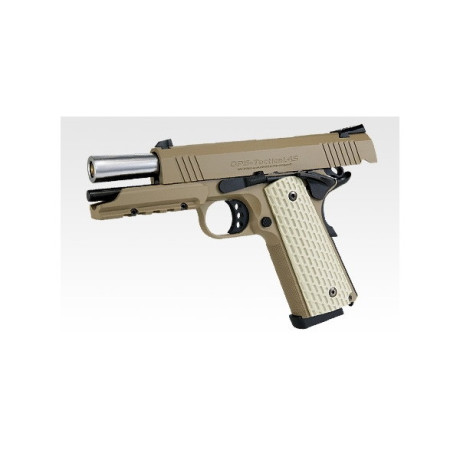 ★ 4.3インチスライドのコマンダーサイズに、ピカティニー規格(20mm幅)のアンダーレイルとダークオフグレーのガナーグリップを備え、デザートカラーを施した姿は「特殊作戦」を行うオペレーター達に随行するに相応しい雰囲気を漂わせたモデルとなっています。