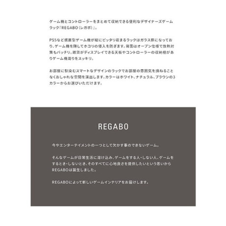 ★インテリアに馴染むゲーム機ラック『REGABO』が登場REGABOによって新しいゲームインテリアをお届けします。★プレステ5が楽々収納大型ゲーム機が楽々収納できます。★ホコリ防止のガラス扉★排熱対策背面がオープン仕様なので排熱対策もバッチリです。* 商品サイズ:25×35×63cm* 材質:合成樹脂化粧合板(PVC)、ガラス、アルミ* 重量:約7.5kg* 組立て式(約30分)