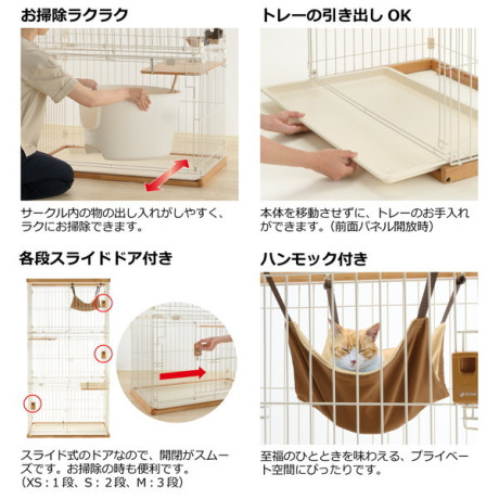 ★ お掃除ラクラク!前面パネルがフルオープン。サークル内の物を出し入れしやすい、広い開口部です。※メーカーの都合により、パッケージ・仕様・成分・生産国等は予告なく変更になる場合がございます。※上記理由でのご返品はお受けできませんので、事前お問合せなどご注意のほど宜しくお願いいたします。* 材質:天然木、スチール、ポリプロピレン、ABS樹脂、他* 組立サイズ:70×57×82Hcm* 適応体重:8kg以下* 付属品:ハンモック、棚板* 生産国:ベトナム