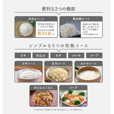 白米・早炊き・炊込み・玄米・お粥・スープ・再加熱・保温