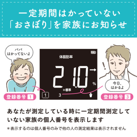 ★ 自分の測定時に、一定期間計測していない家族の個人番号を表示する、「おさぼり番号表示」機能搭載