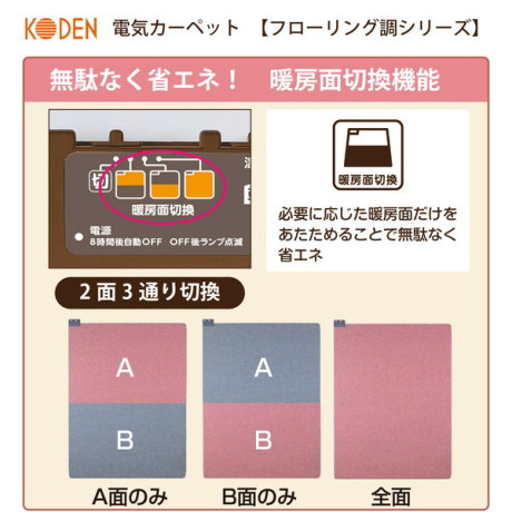 「全体」「A面」「B面」と暖房面を切り替えることができます。一人で使用する際などには「A面」か「B面」に暖房面を設定することで、電気代を節約できます。さらに、電源を消し忘れてしまっても、8時間で自動的にOFFにしてくれるので安心です。