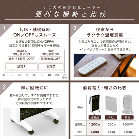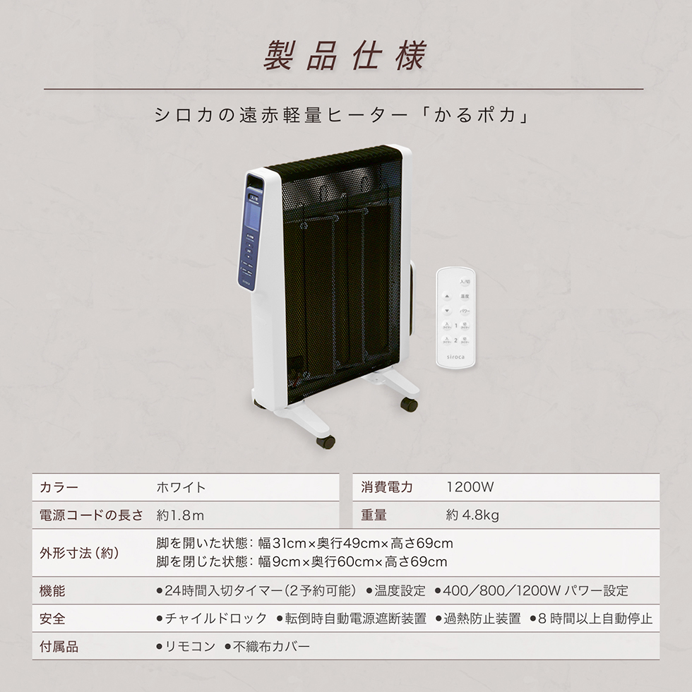 * 安全装置:転倒時自動電源遮断装置、過熱防止装置、チャイルドロック、タイマー設定機能、8時間自動停止機能(タイマー設定時はタイマー優先)