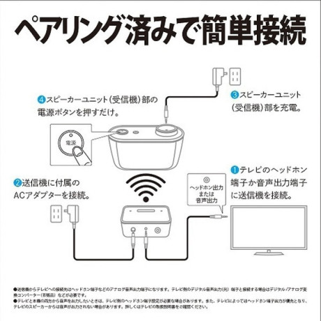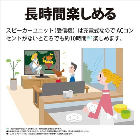 * 同梱品:送信機/ACアダプター(スピーカーユニット部用)/ACアダプター(送信機用)/オーディオケーブル(3極φ3.5mm)(1.5m)/取扱説明書
