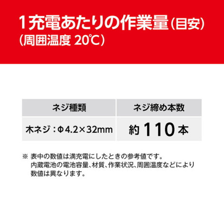 * 最大ネジ締め能力(電池の充電状態、周囲温度、材料により異なります):木ネジ直径5mm