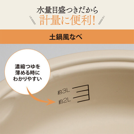 「水量目盛つき」で、濃縮タイプの鍋つゆや雑炊などに便利です(土鍋風なべのみ)。