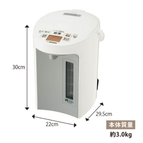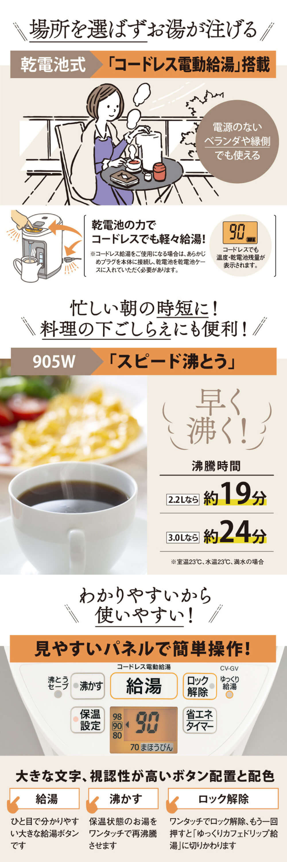 ★ プラグをはずして、どこに持っていっても、かるく注げる「コードレス電動給湯」しかも液晶に湯温表示。(別売単3アルカリ乾電池2本使用)」