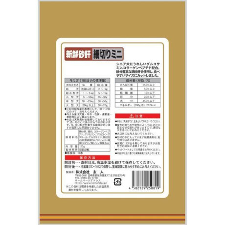 * 原材料: 鶏砂肝、鶏肉、コラーゲンペプチド、グリセリン、プロピレングリコール、グルコサミン、酸化防止剤(亜硫酸Na、V.C、V.E)、調味料(アミノ酸)、リン酸塩(Na)