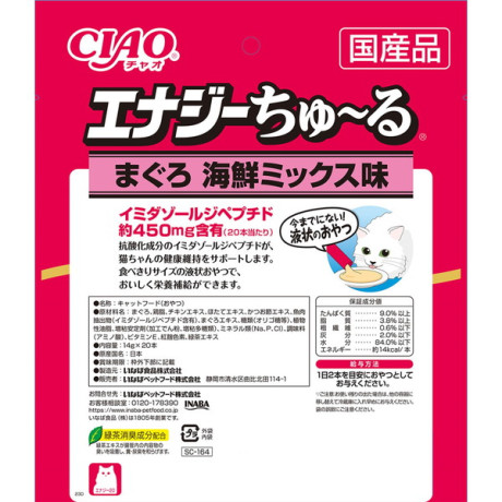 * 原材料(成分):まぐろ、鶏脂、チキンエキス、ほたてエキス、かつお節エキス、魚肉抽出物、まぐろエキス、糖類(オリゴ糖等)、植物性油脂、増粘剤(加工でん粉)、ミネラル類、増粘多糖類、調味料(アミノ酸等)、ビタミンE、紅麹色素、緑茶エキス