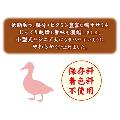 ★ 鉄分・ビタミン豊富な鴨肉の中でより低脂肪なササミを使用。鴨ササミをじっくり乾燥して素材の旨味を濃縮しました。シニア犬や小型犬にも食べやすいやわらか仕上げ。保存料・着色料無添加。農林水産省認定 鳥加熱処理工場製造。