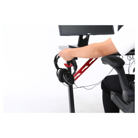 デスク下に格納できる「ヘッドホンフック」と「ドリンクホルダー」付き