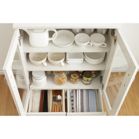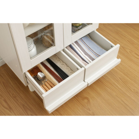 ★ 食器や調理小物、ストック品までまとめて収納できるカップボードです。★ 収納するものに合わせて、自由に棚板の位置を調整できます。★ 引出しは大きめの取っ手が付いているので、引出しやすくなっています。★ 脚付きなので、お掃除が簡単に行えます。* 耐荷重(約):全体52kg、天板20kg、棚板1枚あたり(固定)10kg、(可動)8kg、引出1個あたり3kg* 引出内寸(約):246×283×89mm* 生産国:中国