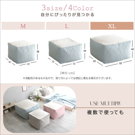 ★ ダイヤモンドキルトを施し、エレガントに仕上げております。★ まるで赤ちゃんのほっぺみたいな「もちっ」とした感触の生地と温かみのある起毛調の生地で2パターンの座り心地が体感できます。* サイズ:約W83×D83×H40cm* 商品重量:約7.2kg* 梱包サイズ:約W55×D55×H65cm* 梱包重量:約7.8kg* 素材/中材:極小ビーズ、ポリエステル、ポリウレタン* その他:カバー取り付け※カバー洗濯可能