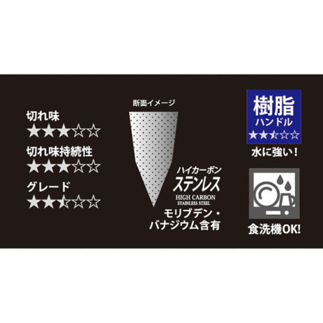 ★ 使いやすいステンレス包丁★ モリブデンバナジウム含有で、耐久性抜群★ 軽くて持ちやすい樹脂ハンドル* サイズ(小数点第1位まで):全長29×幅4.5×高さ1.5cm* 重量(kg):約0.105kg* 素材・材質:刀身/ハイカーボンステンレス鋼(モリブデン・バナジウム含有)、ハンドル/ポリプロピレン(耐熱温度100度)* 原産国:中国* 刃の種類:両刃* 食洗機可否:可