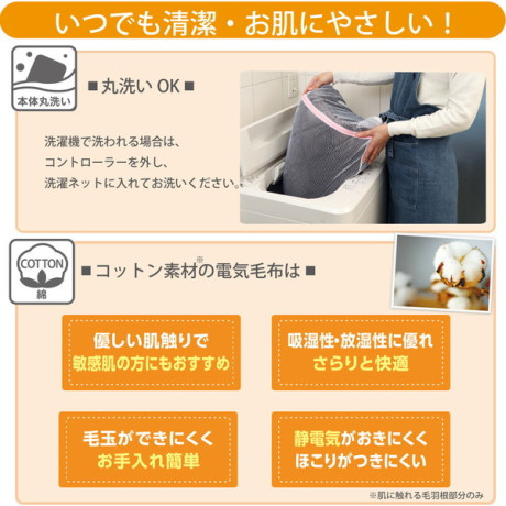 コントローラーを電気毛布本体から取り外し、電気毛布を洗濯ネットに入れることで、洗濯機で丸洗いすることができます。ダニ退治をした後に洗うことで、とても清潔な状態でご使用いただけます。