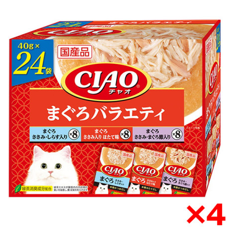 【まぐろ ささみ まぐろ節入り】鶏肉(ささみ)、まぐろ、まぐろ節、かつお節エキス、糖類(オリゴ糖等)、植物性油脂、増粘安定剤(加工でん粉、増粘多糖類)、ミネラル類(Na、P、Cl)、調味料(アミノ酸)、ビタミンE、トマト色素、緑茶エキス