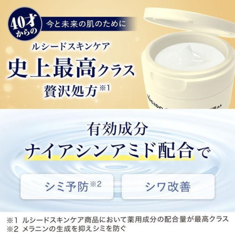 * その他成分: 精製水、ジプロピレングリコール、濃グリセリン、エタノール、スクワラン、デカメチルテトラシロキサン、トリ2-エチルヘキサン酸グリセリル、アクリル酸ナトリウム・アクリロイルジメチルタウリン酸ナトリウム共重合体/イソヘキサデカン/ポリソルベート80、メチルポリシロキサン、モノステアリン酸ポリグリセリル、ポリエチレングリコール1500、サラシミツロウ、ベヘニルアルコール、親油型モノステアリン酸グリセリル、ジペンタエリトリット脂肪酸エステル(1)、アクリル酸・メタクリル酸アルキル共重合体、グリセリンモノ2-エチルヘキシルエーテル、水酸化カリウム、N-アセチル-L-ヒドロキシプロリン、イノシット、1.3-ブチレングリコール、ユビデカレノン、ヒアルロン酸ナトリウム(2)、グリセリル-N-(2-メタクリロイルオキシエチル)カルバメート・メタクリル酸ステアリル共重合体、ポリエチレングリコール、加水分解シルク液