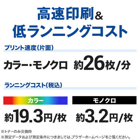 * 付属品:スタータートナーカートリッジ(各色約1000ページ)、ドラムユニット、廃トナーボックス、ベルトユニット、ドライバー&セットアップ用CD-ROM、電源コード、かんたん設置ガイド、保証書