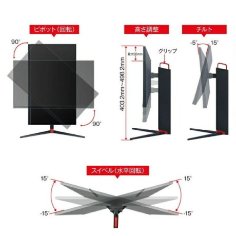 「-15°~+15°のスウィーベル」が可能な多機能スタンドを標準搭載しているため、