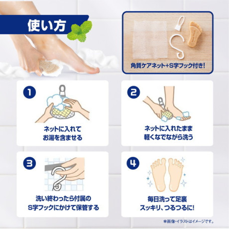 ・ぬるま湯でネットと石けんを濡らし、ネットをつけたまま足裏を洗ってください。