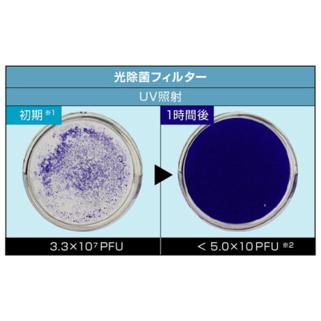 一般的な空気清浄機のフィルターは、菌やウイルス、臭いとなるガス成分を「吸着」させる方式ですが、ブルーデオ(MC-S201)は光除菌フィルターで「元から分解して除去」します。