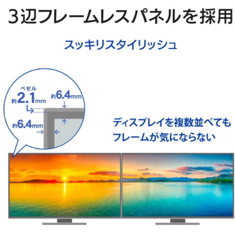 パネルとフレーム(枠)による段差がないフラットなフレームレスパネルを採用しました。極細フレームですっきりした印象を与え、マルチディスプレイにもオススメです。