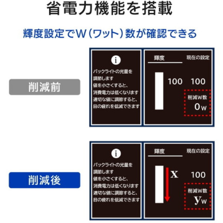 例えば輝度をxまで下げるとyW電力削減して使用することができます。