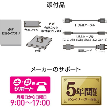 * 付属品: 電源コード(PSE適合品)、USBケーブル(C-C USB 5Gbps (USB 3.2 Gen 1))、HDMIケーブル、台座、台座ネック、台座ネック取付ネジ(2本)、必ずお読みください