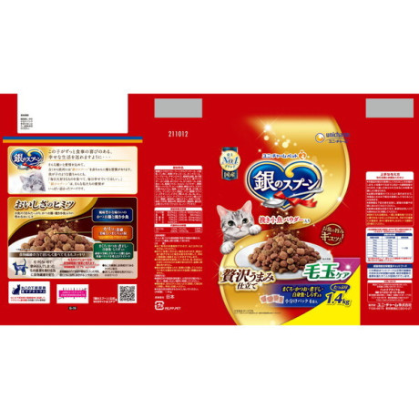 * 原材料:穀類(トウモロコシ、コーングルテンミール、小麦粉、パン粉)、肉類(チキンミール、ポークミール、ビーフミール、チキンエキス)、動物性油脂、魚介類(フィッシュミール、フィッシュエキス、煮干パウダー、かつお節、まぐろミール、かつおミール、白身魚ミール、乾燥シラス)、セルロースパウダー、野菜類(ビートパルプ)、ビール酵母、酵母エキス、ミネラル類(カルシウム、塩素、コバルト、銅、鉄、ヨウ素、カリウム、マンガン、リン、亜鉛)、アミノ酸類(タウリン、メチオニン)、ビタミン類(A、B1、B2、B6、B12、C、D、E、K、コリン、ナイアシン、パントテン酸、ビオチン、葉酸)、着色料(二酸化チタン、赤色102号、赤色106号、黄色4号、黄色5号)、調味料、酸化防止剤(ミックストコフェロール、ハーブエキス)