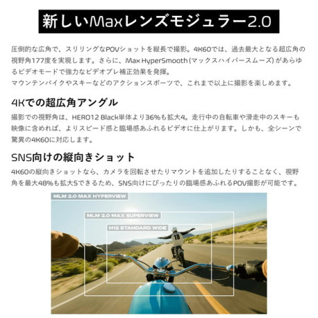 Max (マックス) レンズモジュラー2.0をHERO12 Blackに追加すれば、177°というHEROカメラ史上最大の画角を誇る、究極のPOVカメラが誕生します (初代MaxレンズモジュラーのFOVは155°)。
