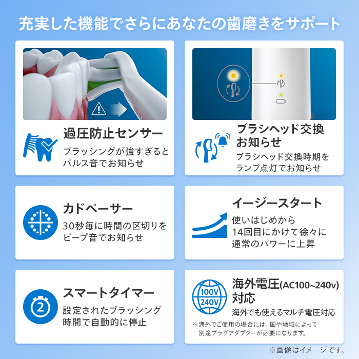 * 使用可能時間:約2週間(満充電後、2分間のブラッシングを1日2回の場合)