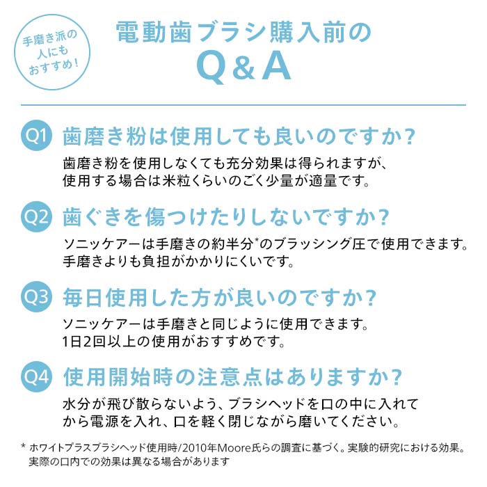 * 付属品:ハンドル、ホワイトプラスブラシヘッド(1本)、プレミアムガムケアブラシヘッド(1本)、舌磨きブラシヘッド、充電器台(1個)