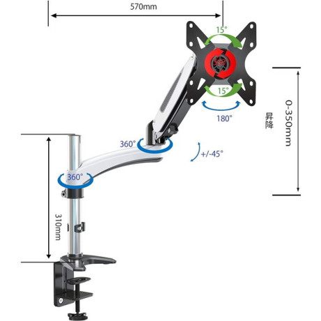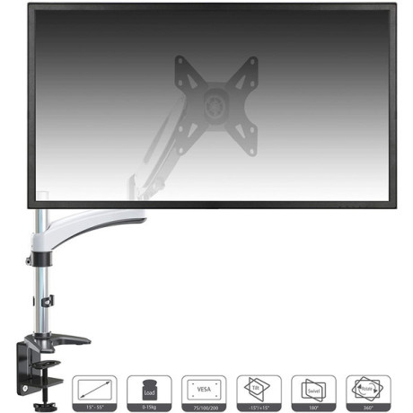 クランプ式で抜群の安定性。液晶モニターの転倒を防ぎ、耐震に効果があります。穴あけ不要、6cm厚までの天板に簡単に設置可能です。ガス式でアーム位置をスムーズに調節できます。大画面55インチまでのモニターに対応