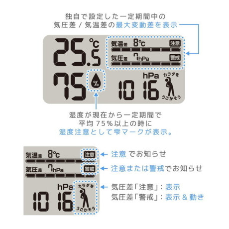 ★ 気圧差が大きい場合画面マークが動いてお知らせ。カラダを動かすようにしましょう。