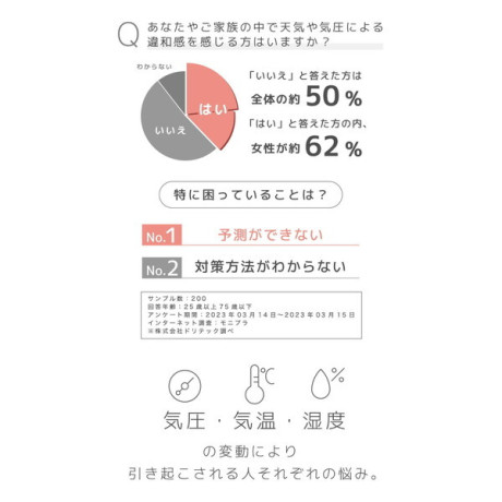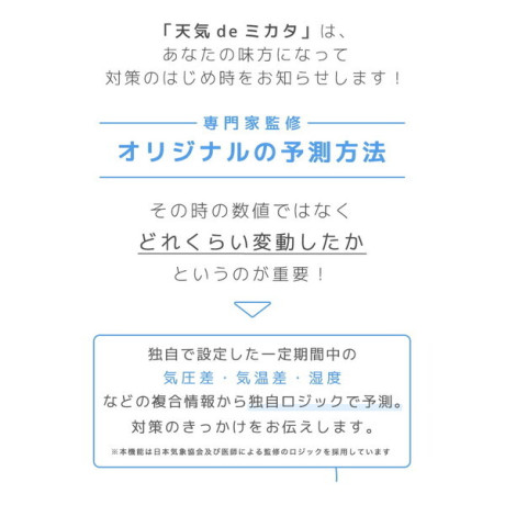 ★ 専門家監修の一定時間の気温差・気圧差・湿度を元に独自のロジックによる予測で、体調変化の対策のきっかけを注意/警告してくれるお知らせ機能があります。
