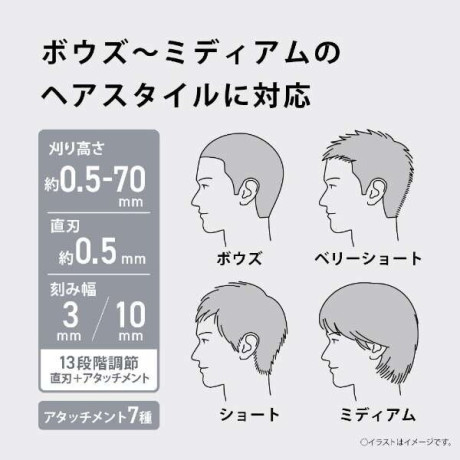 * アタッチメントの種類:耳まわり&ナチュラルアタッチメント、スキ刈りアタッチメント、刈り高さアタッチメント(3 mm刻み)(3/6 mm)、(9/12 mm)、(15/18 mm)、スライドアタッチメント(10 mm刻み)(20・30・40 mm)、(50・60・70 mm)
