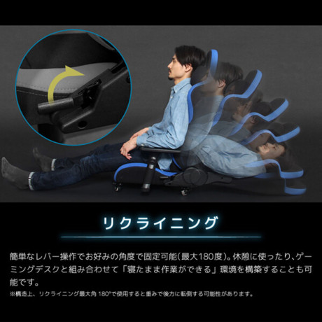 簡単なレバー操作でお好みの角度で固定可能(最大180度)。休憩に使ったり、ゲーミングデスクと組み合わせて