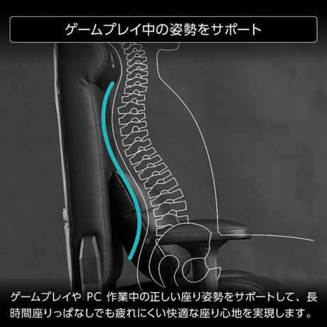 ゲームプレイやPC作業中の正しい座り姿勢をサポートして、長時間座りっぱなしでも疲れにくい快適な座り心地を実現します。