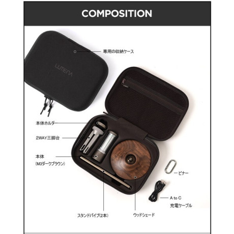 * セット内容: LUMENA M3(ブラウン)本体、収納ケース、本体ホルダー、2WAY三脚台、スタンドパイプ(2本)、ウッドシェード、ビナー、AtoC充電ケーブル