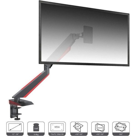 ★ 本製品は15インチから34インチのモニターに対応した液晶ディスプレイアームです。4軸での位置調整が可能なので、ゲームプレイに最適なポジションにゲーミングモニターを固定することができます。重量8kgおよびVESA75x75、100x100のモニターで使用することが可能です。クランプ式で8cmまでの天板に簡単に設置が可能、またLEDを内蔵し赤色に点灯することでゲームプレイを盛り上げます。