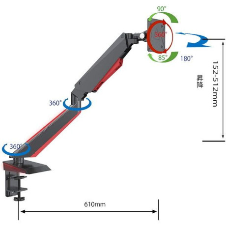 クランプ式で抜群の安定性。液晶モニターの転倒を防ぎ、耐震に効果があります。穴あけ不要、8cm厚までの天板に簡単に設置可能です。ガス式でアーム位置をゲームプレイに最適なポジションに調整できます。LED内蔵でゲームプレイを演出します。