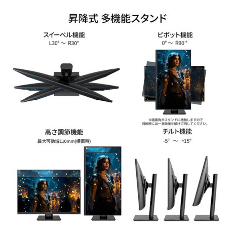 ★ 昇降式スタンドを採用、110mmの範囲(横置時)で高さ調節が可能です。また縦画面として使用出来るピボット(回転)機能にも対応します。