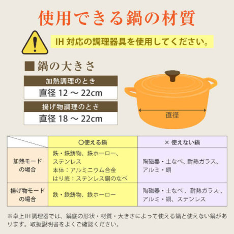 鍋が置かれていない、使用できない鍋がのせられている場合、加熱が停止します。