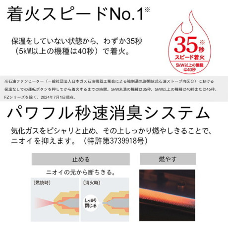 ※家庭用石油ファンヒーター(一般社団法人日本ガス石油機器工業会による強制通気形開放式石油ストーブ内区分)における保温なしでの運転ボタンを押してから着火するまでの時間。5kW未満の機種は35秒、5kW以上の機種は40秒または45秒。FZシリーズを除く。2024年7月1日現在。