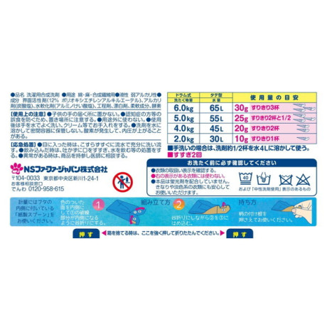 * 成分:界面活性剤(12% ポリオキシエチレンアルキルエーテル)、アルカリ剤(炭酸塩)、水軟化剤(アルミノけい酸塩)、工程剤、漂白剤、柔軟成分、酵素