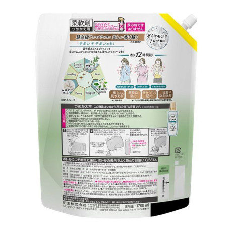 * 成分:界面活性剤(エステル型ジアルキルアンモニウム塩、ポリオキシエチレンアルキルエーテル)、安定化剤、香料