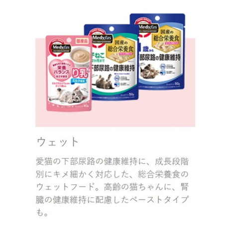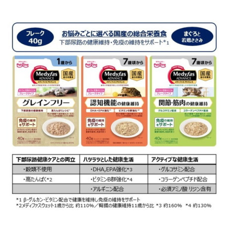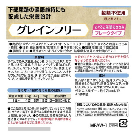 * 原材料:まぐろ、ささみ、大豆油、ぶどう糖、フィッシュエキス、かつお節、オオバコ繊維、β-グルカン、ビタミン類(A、D3、E、K3、B1、B2、パントテン酸、ナイアシン、B6、葉酸、ビオチン、B12、コリン)、ミネラル類(カルシウム、リン、ナトリウム、カリウム、塩素、鉄、銅、マンガン、亜鉛、ヨウ素)、タウリン、増粘安定剤(キサンタンガム)