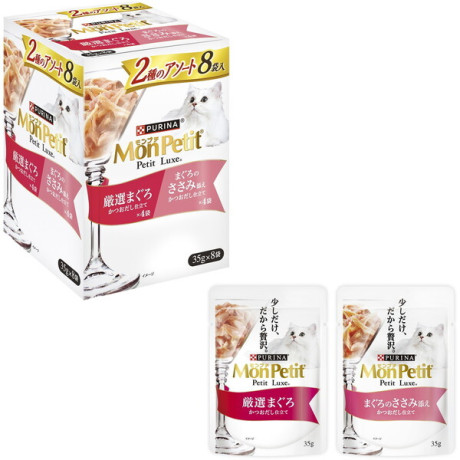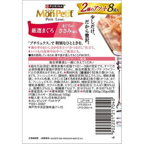 【まぐろのささみ添え】魚介類(かつお、まぐろ、フィッシュエキス)、肉類(ささみ)、調味料、増粘安定剤(加工でんぷん、増粘多糖類)、カラメル色素、ビタミンE